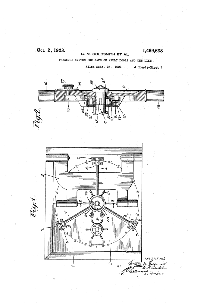 Above: Patents filed by The Mosler Safe Company, Gustave M. Goldsmith listed as principal inventor. Click to expand images. Images obtained from Google Patents.